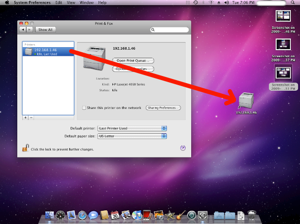 Open System Preferences, go to Print & Fax and drag the particular printer to your Desktop.