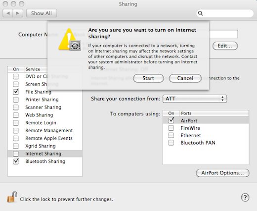 After completing and configuring the AirPort, click the Internet Sharing checkbox, which will bring up a confirmation message.